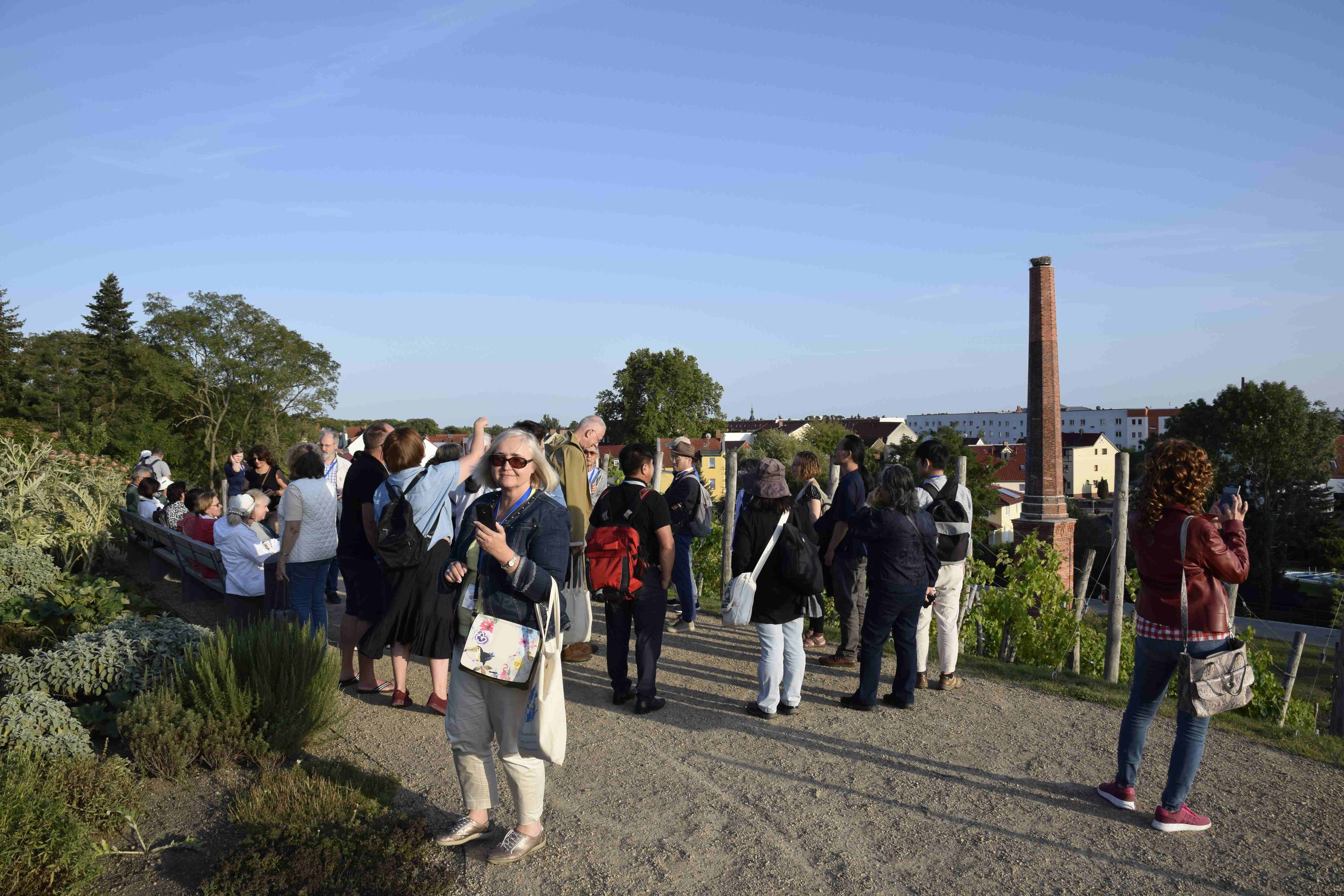 - Burg, the city of towers, as seen from the vineyard. The traditional excursion ended in Burg, and the participants enjoyed a magnificent view from the city vineyard before going to dinner.